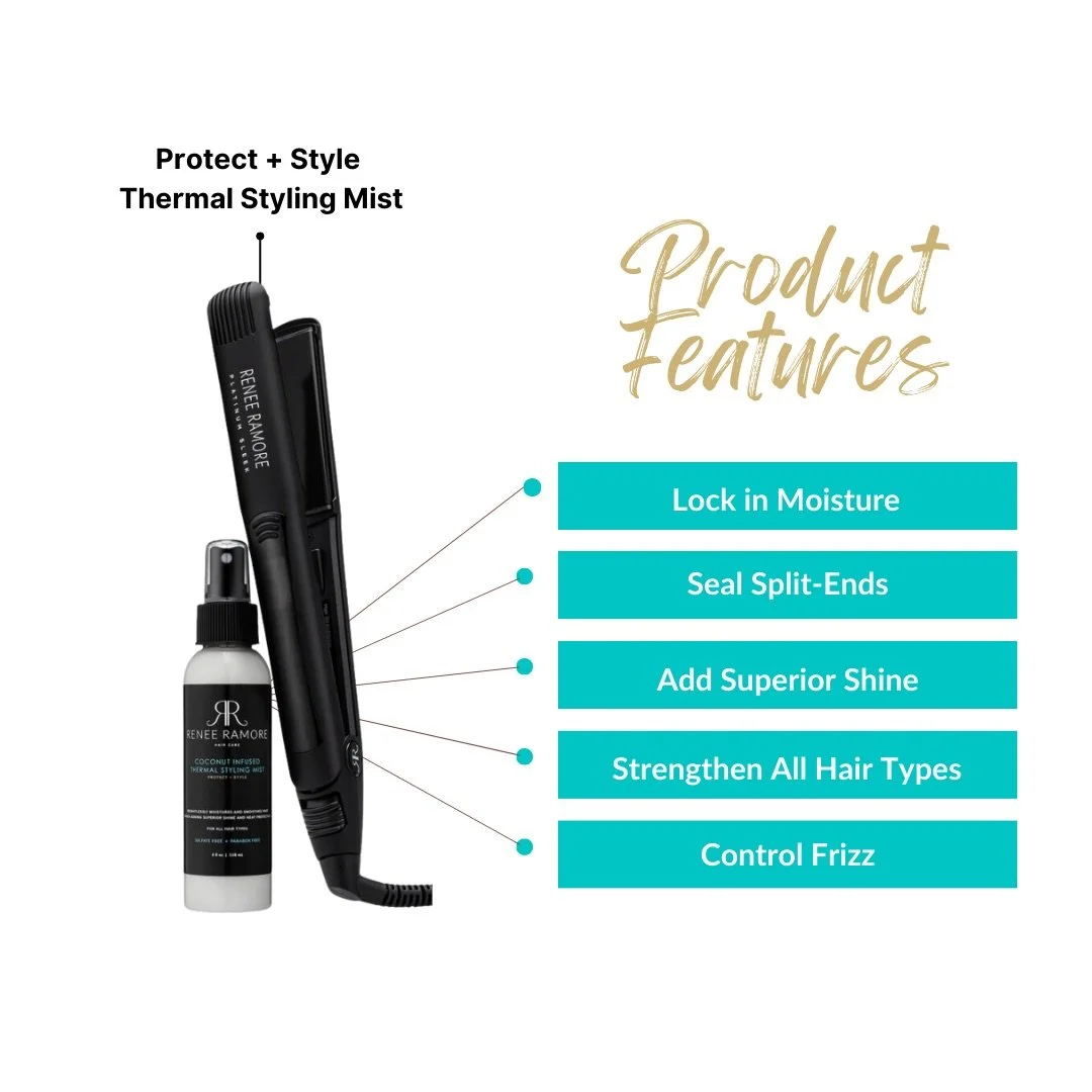 Start with Protect + Style, your lightweight thermal shield designed to guard against heat damage, lock in moisture, and prep the hair for styling. Then go in with the Platinum Sleek Flat Iron, engineered to glide effortlessly with consistent heat for a polished, long-lasting finish.